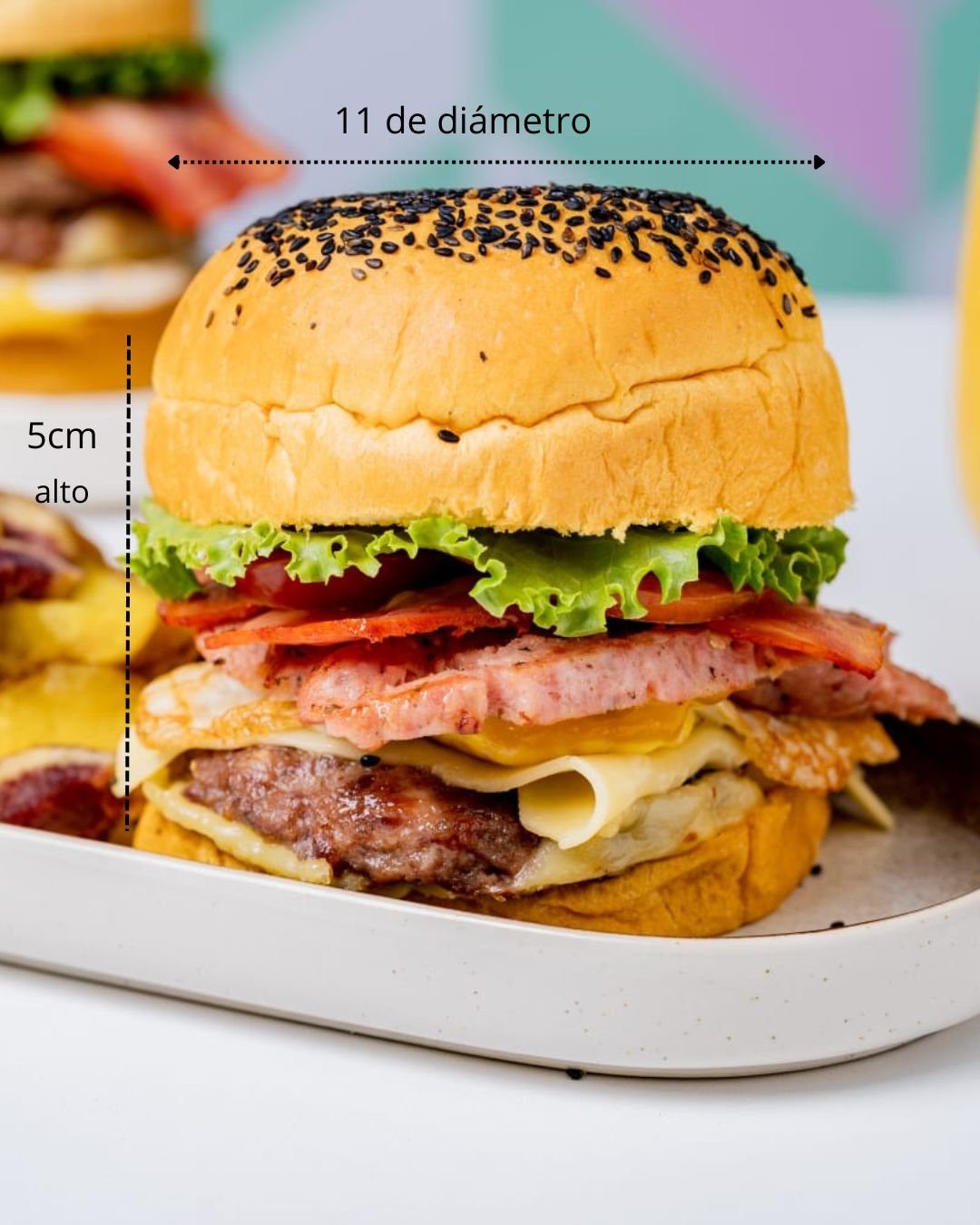 Disfruta nuestros panes brioche artesanales, en tamaño #11 de diámetro, elaborados con ingredientes seleccionados y una fermentación perfecta que les da una textura increíblemente suave y esponjosa. Su corteza dorada, delicadamente decorada con semillas, y su sabor ligeramente dulce los convierten en la base ideal para hamburguesas gourmet o para acompañar cualquier creación especial. Calidad, frescura y presentación premium en cada pieza. 🍞✨